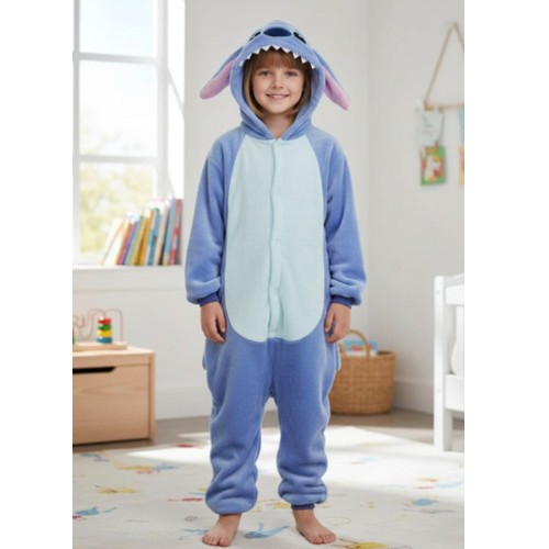Mekani jednodelni kostim/pidžama za decu, inspirisan likom Stitch (plava). Napravljen od toplog, plišanog flisa – savršen za spavanje, kućno druženje, žurke, rođendane, maskembale i vrtićke predstave. Kapuljača sa ušima i vezeni detalji čine komplet ultra-slatkim, a rajsferšlus/dugmad (u zavisnosti od serije) olakšavaju oblačenje.